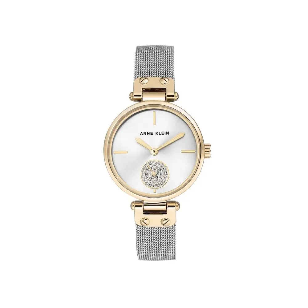 Wymiary produktu : 20 x 20 x 16 cm; 136,08 g ; Producent : Precision Watch Co. – Division of E. Gluck Corporation ; Numer modelu : AK 3001SVTT ; Dział : Kobiety ; Materiał : Stal szlachetna ; Wodoszczelność do 30 m: ogólnie odporna na pryskającą wodę lub krótkie zanurzenie w wodzie, ale nie nadaje się do pływania lub kąpieli. Średnica koperty: 34 mm. Japoński mechanizm kwarcowy. Srebrna bransoletka z siateczki z regulowanymi ogniwami końcowymi; ozdobne zamknięcie i przedłużenie. Soczewka mineralna kryształowa; srebrna tarcza Sunray ze złotymi wskazówkami i oznaczeniami; zestaw radiowy z 35 przezroczystymi kryształkami premium. OPIS PRODUKTU ; Zegarek damski 3000 ANNE KLEIN zaprojektował błyszczący dodatek, który jest odpowiednim towarzyszem na każdą okazję. Srebrna tarcza błyszczy w promieniu słońca i jest ozdobiona aplikacjami w kolorze złotym. Już to rzadkie połączenie srebra i złota sprawia, że zegarek jest modnym hitem. Wskazówki można odczytać na cyferblacie. Dolna połowa zegarka jest ozdobiona okrągłymi kamieniami. Błyszczą jak małe gwiazdy i promieniują z osobą, która o każdej porze dnia. Ramka dopasowuje się kolorystycznie do złotej obudowy. Design jest kontynuowany przez srebrny pasek siatkowy, który jest przymocowany do koperty zegarka za pomocą małych śrub. Dzięki dodatkowym zamocowanym ogniwom zegarek można indywidualnie dopasować do rozmiaru. Klamra bezpieczeństwa, podobnie jak tył obudowy, posiada wygrawerowane logo marki głowy lwa i przedstawia charakterystyczną siłę kobiet, która w przypadku ANNE KLEIN zawsze służyła jako inspiracja. Istnieje nie tylko właściwy sposób na noszenie mody. ANNE KLEIN stawia wszechstronność w centrum mody i zachęca kobiety do realizacji tej kreatywności na co dzień. Ponieważ sukienki nie zmienią świata, będą to kobiety, które je noszą. Anne Klein.
