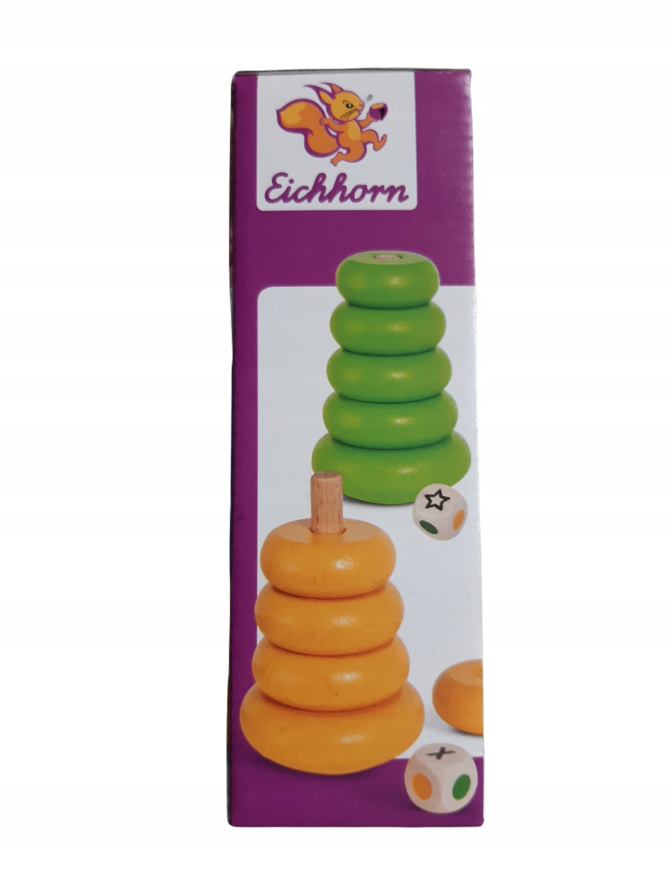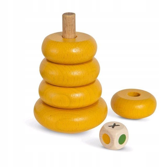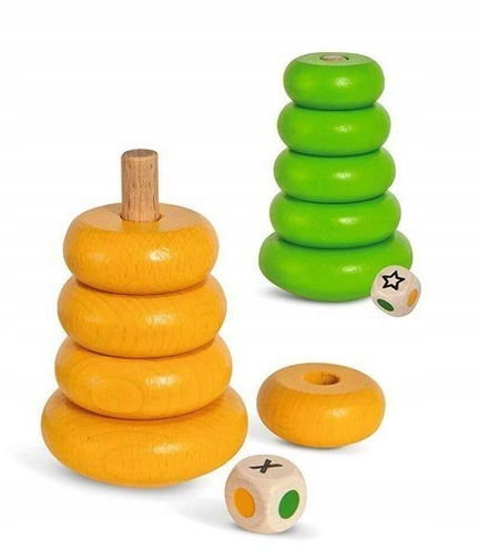 Drewniana piramida z krążkami doskonała do zabawy dla najmłodszych. W opakowaniu znajdują się dwie piramidki: pomarańczowa oraz zielona. Do zabawy można użyć specjalnej kostki, aby zamienić ją w grę dla dwóch osób. Wykonane zostały z wysokiej jakości materiałów. Wspomagają wyobraźnię i kreatywność dziecka. Rozwija koordynację wzrokowo–ruchową.