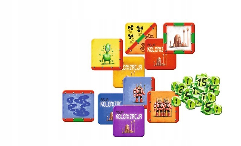 Każdy gracz otrzymuje zestaw 24 kafelków w swoim kolorze. Każdy ma tyle samo i dokładnie takie same, tylko w innej kolejności (kafelki tasujemy przed grą). Na środku wykładamy stację początkową – od niej rozpoczniemy kolonizację. Dodatkowo dobrze wysypać wszystkie “kosmiczne kryształy” – czyli po prostu punkty. Będziemy je zdobywać w czasie gry.