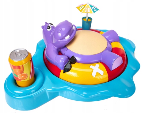 GRA ZRĘCZNOŚCIOWA HIPCIO NA GAZIE – FIZZY DIZZY HIPPO To wspaniała gra zręcznościowa dla Twojego dziecka od TOMY. Rozwija refleks i wprowadza do zabawy ducha rywalizacji. Hipcio uwielbia swój gazowany napój i nie potrafi się mu oprzeć. By wygrać, spraw żeby Hipcio beknął. ROZGRYWKA: Przygotowanie: Wszyscy gracze ustawiają się wokół Hipopotama. Należy włożyć parasolkę oraz słomkę. Gra jest gotowa. Cel gry: Rundę wygrywa gracz, który jako pierwszy spowoduje, że Hipcio zacznie się kręcić i bekać. Zabawę wygrywa ten, który jako pierwszy wygra trzy rundy. Zasady gry: Wybieramy osobę do rozpoczęcia gry, może to być najmłodszy uczestnik lub ktoś wylosowany. Zadaniem gracza jest zakręcenie parasolką, słomka wskaże ile razy należy nacisnąć puszkę z ulubionym napojem naszego Hipcia. Brzuch hipopotama zaczyna rosnąć. Pozostali gracze powtarzają czynność, aż do momentu w którym Hipcio zacznie bekać. Następuje koniec rundy. Rozgrywka toczy się do trzech zwycięskich rund. Ważne: Po skończonej zabawie upewnij się, że brzuch Hipcia jest płaski, a przycisk na spodzie zabawki znajduje się w pozycji OFF. Gra wyzwoli mnóstwo pozytywnych emocji i dużo śmiechu. Gwarantowana świetna zabawa dla dzieci i dorosłych. Zabawka posiada certyfikat CE. ZAWARTOŚĆ ZESTAWU: – Hipcio / podstawka do gry, – Parasolka, – Słomka, – Arkusz z naklejkami, – Wielojęzyczna instrukcja. ZASILANIE: 2 baterie 1.5V AAA (LR03) – nie załączone LICZBA GRACZY: Od 2 do 4 graczy. 27 x 27 x 11 cm WAGA OPAKOWANIA: – Ok. Opakowanie gry jest w angielskiej wersji językowej. Na opakowaniu znajduję się nalepka od polskiego dystrybutora, zawierająca podstawowe informacje.
