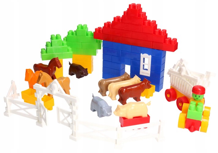 Super zestaw klocków ze zwięrzątkami, płotkiem wraz z uchylną bramą, pojazdami.
