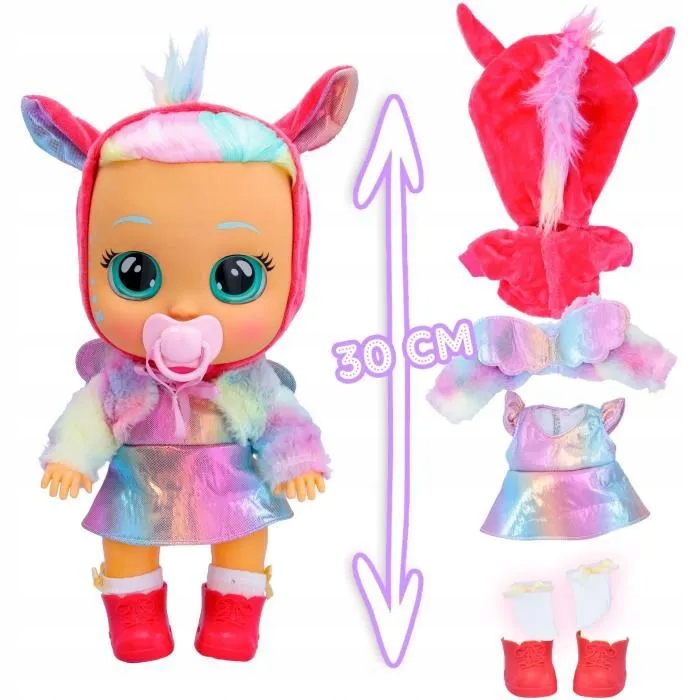 Poznaj lalkę Cry Babies Fantasy Hannah w nowym wyglądzie! Podobnie jak wszystkie nowe, odnowione Cry Babies, ma super miękkie włosy, jeszcze bardziej realistyczne kryształowe oczy i ulepszoną, bardziej miękką twarz. Waga została również zmniejszona i teraz po raz pierwszy ma na sobie uroczy strój z prawdziwego fantasy. Oczywiście, jak wszystkie Cry Babies, płacze wielkimi łzami i wydaje realistyczne odgłosy dziecka, gdy zabierasz jej smoczek. Jeśli go oddasz, przestanie płakać. Możesz też delikatnie je położyć, aby je uspokoić. Hannah ma przemienny strój, parę butów i pasujący smoczek.