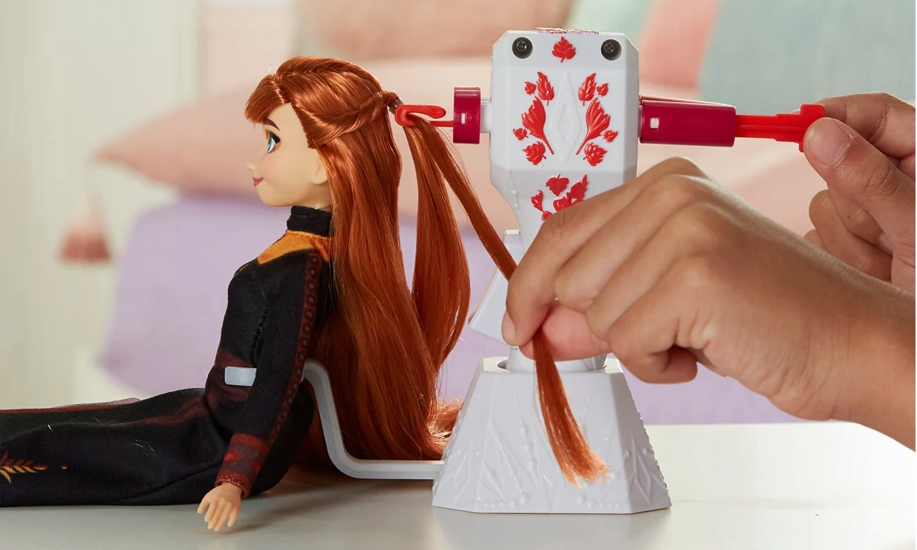 Lalka Anna w sukni z najnowszej części filmu “Kraina Lodu 2”. Lalka ma długie włosy, które dziewczynki mogą czesać. W zestawie znajduję się zaplatacz do włosów, dzięki którym można zaplatać lalce warkoczyki. Wystarczy włożyć kosmyki włosów do maszynki zaplatającej, nacisnąć guzik i obserwować, jak urządzenie splata włosy w warkocz! Zaplatacz warkoczyków działa mechanicznie, poprzez naciskania przycisku na uchwycie urządzenia.