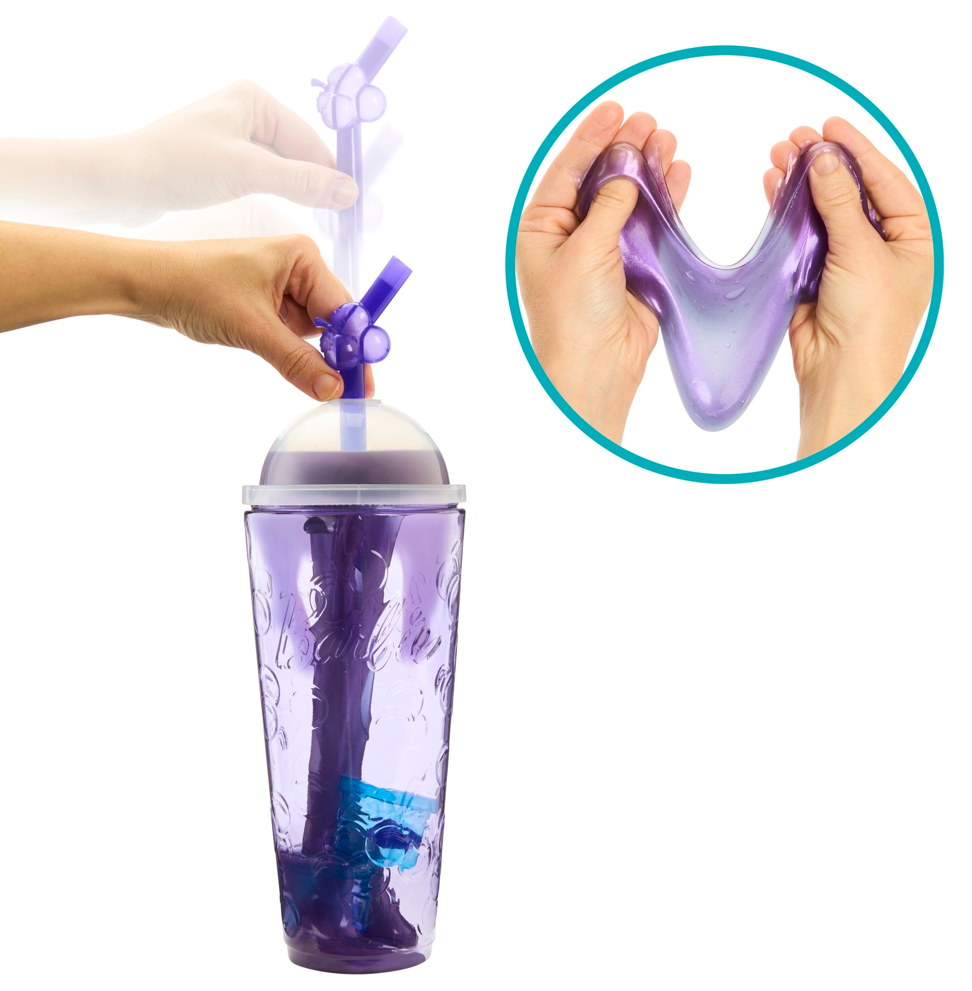 Dzieci zdejmują zewnętrzną warstwę opakowania, otwierają kubek i wyciągają woreczki z niespodziankami, a następnie zakręcają pokrywkę i podnoszą górę za pomocą słomki, aby uwolnić gąbczasty, różowy Slime na kostki lodu!