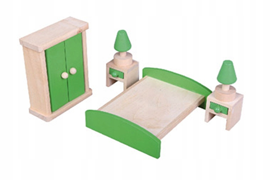 Śliczny zestaw mebelków do sypialni domku dla lalek. Wykonane z naturalnego drewna. Piękne kolory i wysoka jakość wykonania z pewnością przypadną do gustu każdej młodej damie.