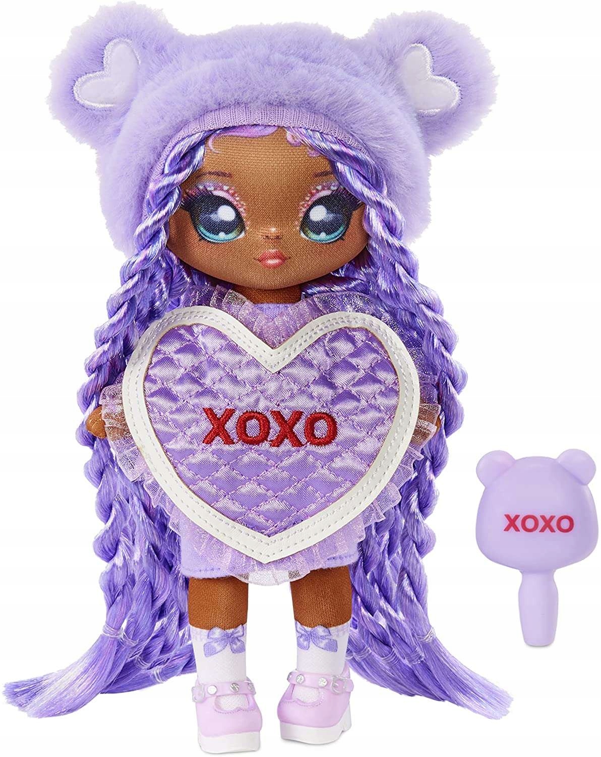 Wraz z laleczką w zestawie znajduje się szczotka do włosów “Xoxo” w kolorze fioletowym.