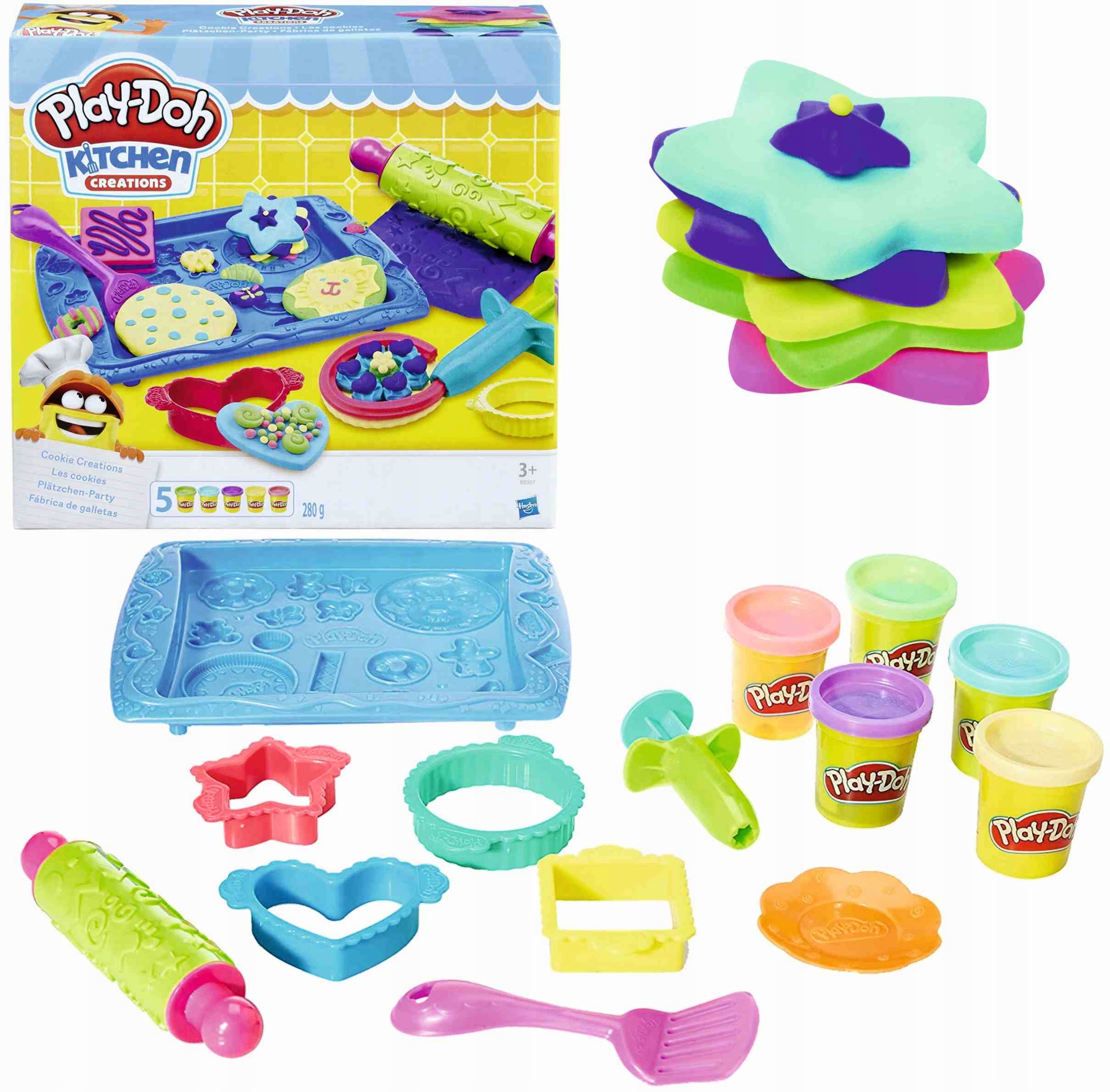 W komplecie znajdziesz wszystko, czego potrzeba do przygotowania pysznych ciastek z masy Play-Doh — wałek, foremki, tackę, łopatkę, wytłaczarkę i aż 5 kubków kolorowej masy (280 g). ?
