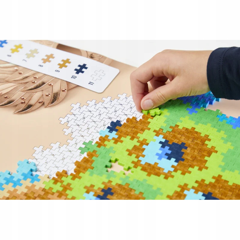 Klocki Plus-Plus to nieograniczone możliwości zabawy. Możemy budować przestrzennie, konstrukcyjnie z płytkami i kółkami lub na płasko. Jeśli lubisz puzzle to ten zestaw jest dla Ciebie. Zestawy Puzzle po numerach to również poznawanie cyfr oraz nauka wielu wspaniałych kolorów. W każdym zestawie znajduje sie duża podkładka z gotowym szablonem wzoru. Rysunek z wrysowanymi elementami jest w skali 1:1, więc możesz układać bezpośrednio na podkładce. Zacznij od posortowania kolorów i rozłożenia podkładki. Układaj zgodnie z numerami na szablonie. Każda cyfra ma przyporządkowany kolor klocka Plus-Plus mini. Po ułożeniu układanki możesz swoje Plus-Plus Puzzle zawiesić na ścianie – piękna, własnoręcznie przygotowana dekoracja pokoju (rysunkowa instrukcja jak zrobić zawieszkę jest w środku opakowania).