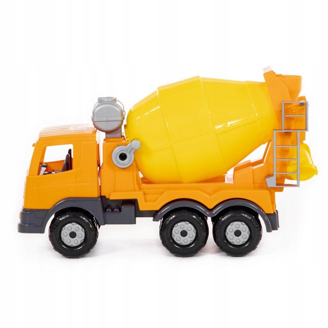 Duża ciężarówka z kabiną dla dwóch pasażerów, w której łatwo umieścić figurkę kierowcy i operatora betoniarki. Na pace ciężarówki znajduje się duży bęben.