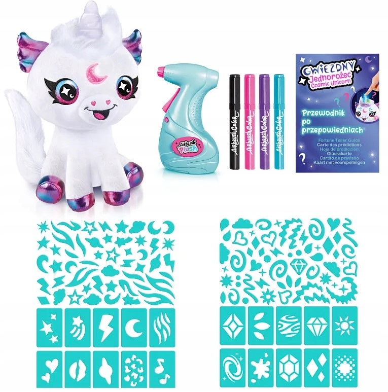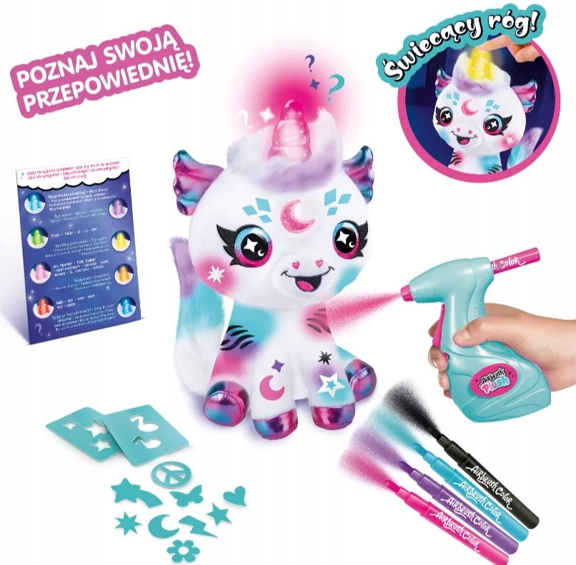 Gwiezdny Jednorożec to więcej niż plusz. Można go dekorować za pomocą dołączonego do zestawu aerografu lub markerów. Można zadać mu pytanie, na które „odpowie”, używając odpowiedniego koloru. Po zabawie Gwiezdnego Jednorożca można wyprać i stworzyć nowe stylizacje od początku.