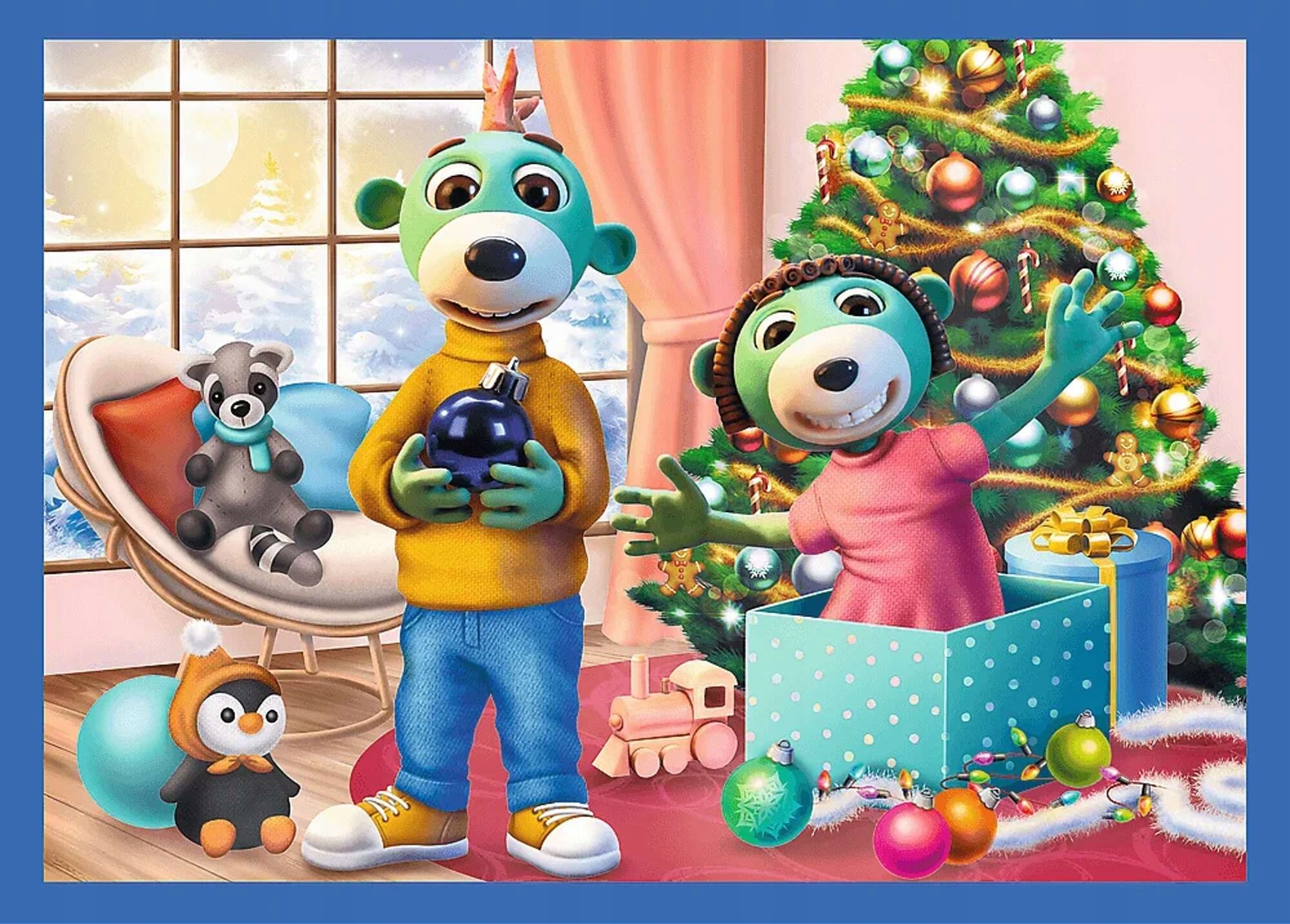Zestaw puzzli składa się z 4 osobnych barwnych obrazków z bohaterami rodziny Treflików, z różną ilością elementów. Każdy ułożony obrazek ma wymiary 28,5 x 20,5 cm.