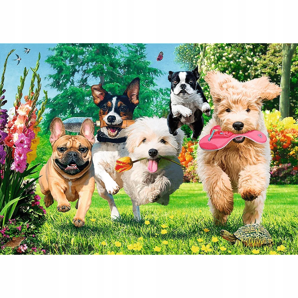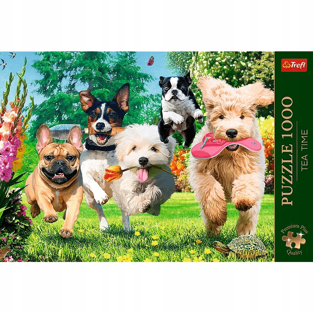 Puzzle 1000 elementów przedstawiają uchwycone w biegu, rozkoszne, psiaki.