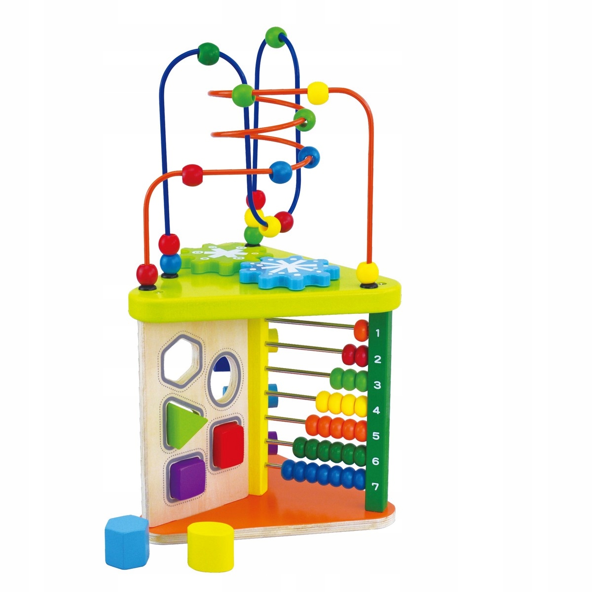 6 klocków o różnych kształtach które dziecko przesuwa po wyznaczonych torach