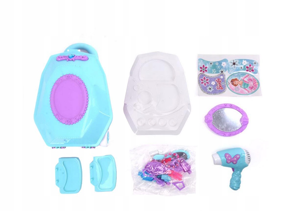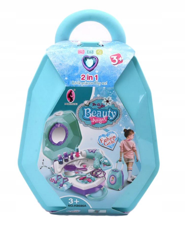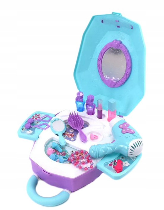 Toaletka dla Dziewczynki 2w1 Salon Piękności w Walizce to idealna propozycja dla wszystkich małych księżniczek. Dzięki temu zestawowi dziecko może poczuć się jak prawdziwa księżniczka oraz posiada wszystko, aby przygotować się na wielki bal lub wyjście z przyjaciółmi. Wewnątrz walizki znajduje się lusterko i rozkładany blat toaletki. Zestaw oprócz akcesoriów jak lusterko, spinki czy szczotkę posiada, również suszarkę na baterię, która działa jak prawdziwa – dmucha powietrzem. Kosmetyki i inne akcesoria idealnie odwzorowują rzeczywiste przedmioty, co pozwoli wcielić się w małą księżniczkę!