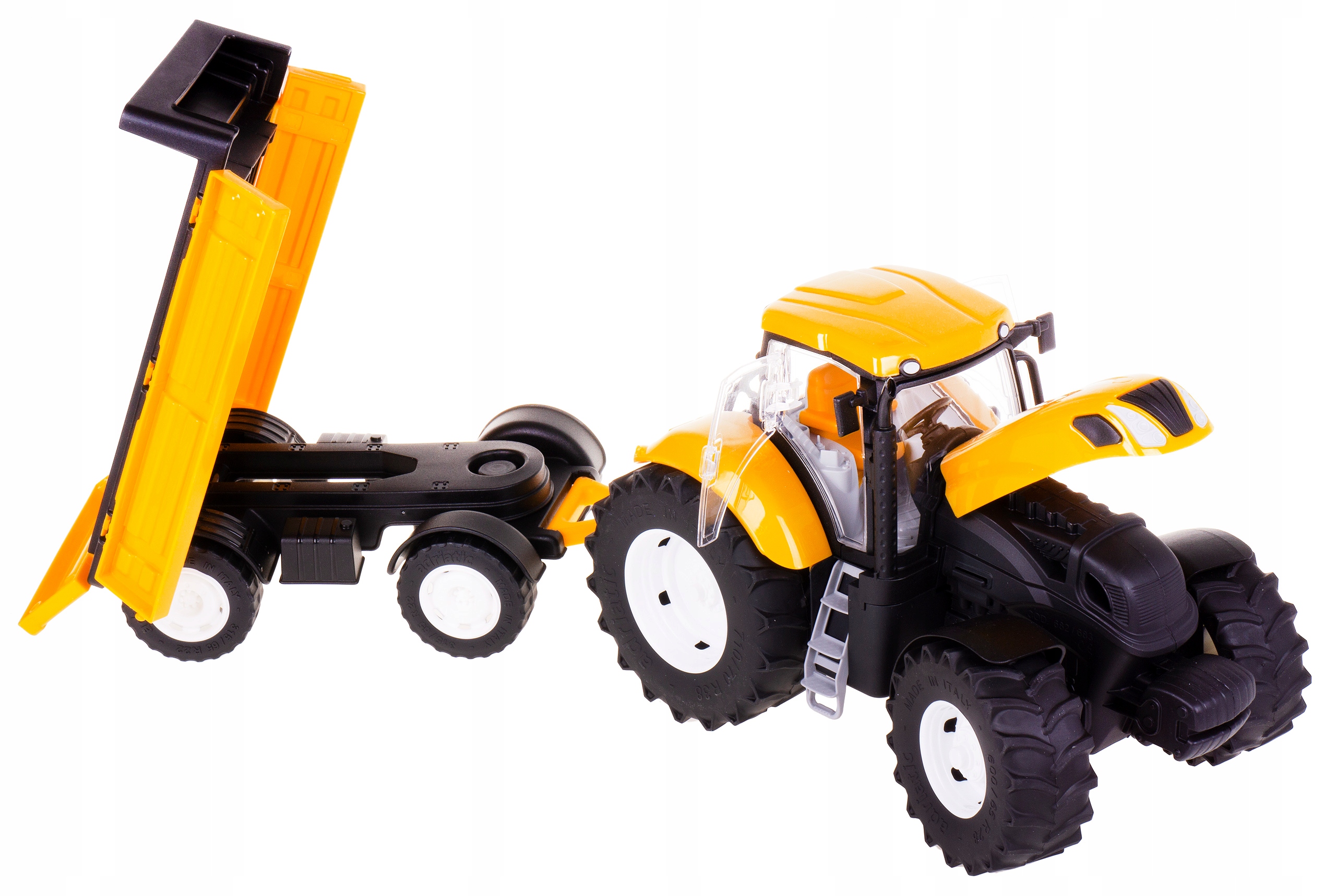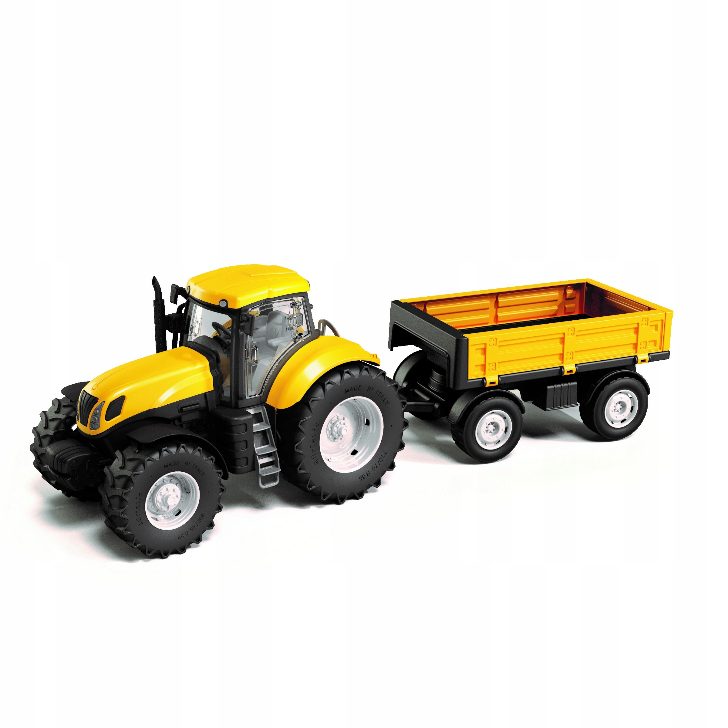 Żółty traktor, który zachwyci każdego chłopca! Traktor został wyposażony w aktywne przednie zawieszenie. Ponad to posiada z tyłu kierownicę, która umożliwia sterowanie przednią skrętną osią. Zabawę również uatrakcyjni podnoszona do góry maska, drzwi oraz burty w przyczepce. Traktor posiada szerokie koła z bieżnikiem wykonane z prawdziwej gumy, zatem poradzą sobie w każdym terenie. Dodatkowo w zestawie jest pojemna przyczepa, którą bez trudu można przewieźć wszystko co potrzeba. Zarówno traktor jak i przyczepa zostały wykonane z wysokiej jakości tworzyw sztucznych, dlatego też zabawka posłuży na długi czas. Zabawka została zapakowana w pudełko.