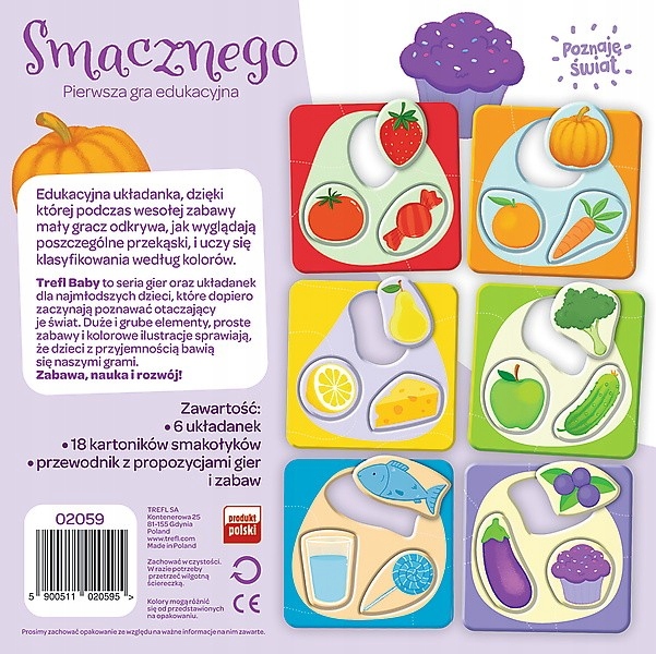 Edukacyjna układanka, dzięki której podczas wesołej zabawy mały gracz odkrywa jak wyglądają poszczególne przekąski, i uczy się klasyfikowania wedlug kolorów.