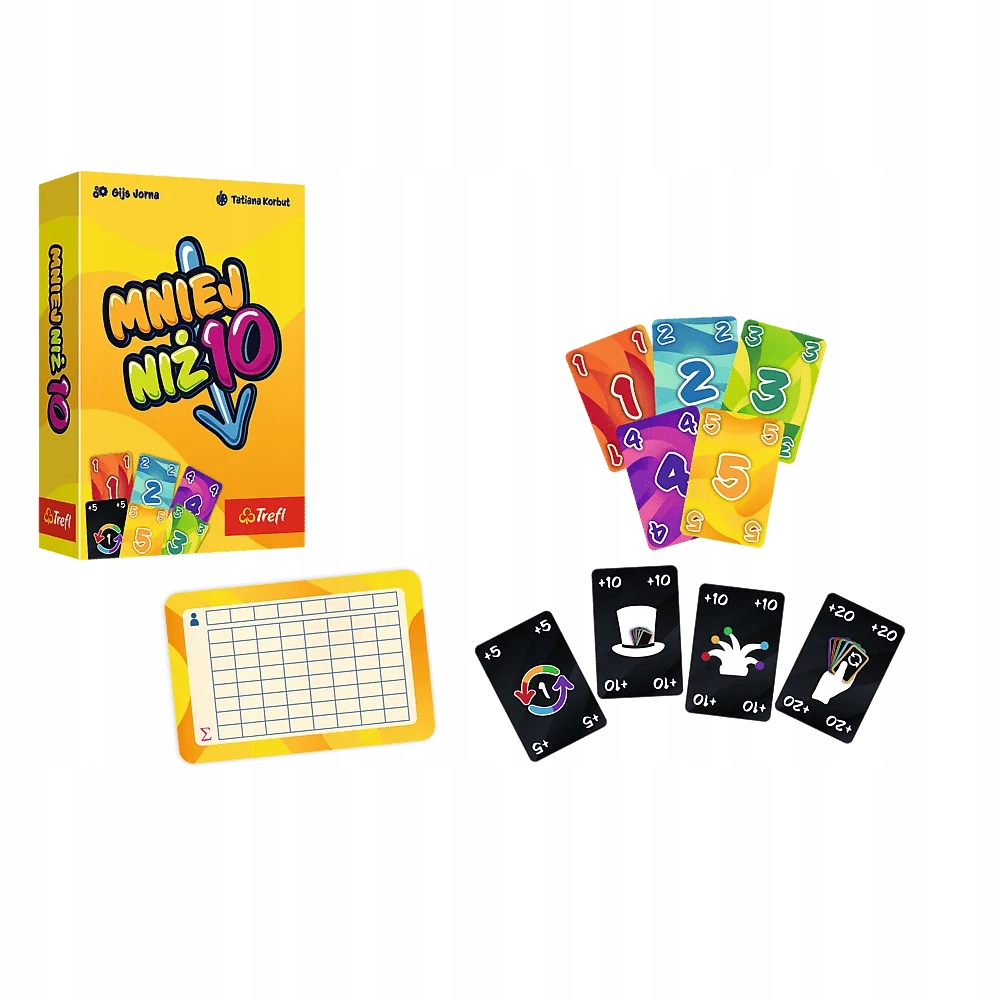 Mniej niż 10 to gra karciana dla osób, które lubią emocjonującą rozgrywkę i szybką analizę sytuacji. Gracze starają się zagrać karty tak, by suma ich wartości na ręce była jak najniższa – najlepiej poniżej dziesięciu! Gdy ktoś ogłosi „Mniej niż 10!”, runda może się zakończyć… ale czy na pewno wygra? Zaskakujące zwroty akcji, rywalizacja i proste zasady sprawiają, że to idealna gra na każdą okazję.