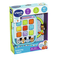 Zabawka marki VTech Kolorowy Tablet rozwija słownictwo oraz rozwój sensoryczny u dziecka. Uczy kolorów, kształtów, radosnych piosenek oraz nazw zwierząt.