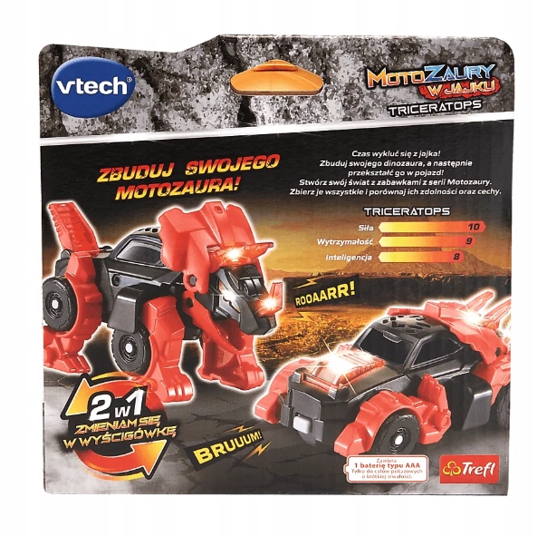 Czas wykluć się z jajka! Odkryj niezwykłą zabawkę z Motozaurami Vtech, która łączy świat dinozaurów z fascynującą motoryzacją! Zbuduj potężnego Triceratopsa , a potem przekształć go w dynamiczną wyścigówkę. Dzięki efektom świetlnym, realistycznym dźwiękom i zabawnym frazom, zabawa nabiera zupełnie nowego wymiaru!