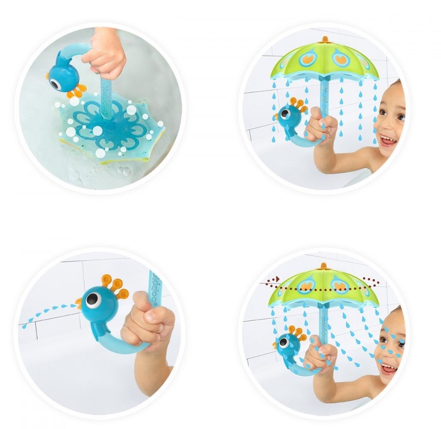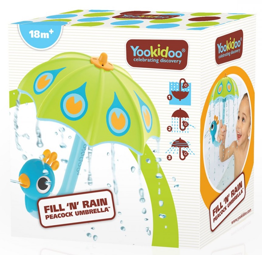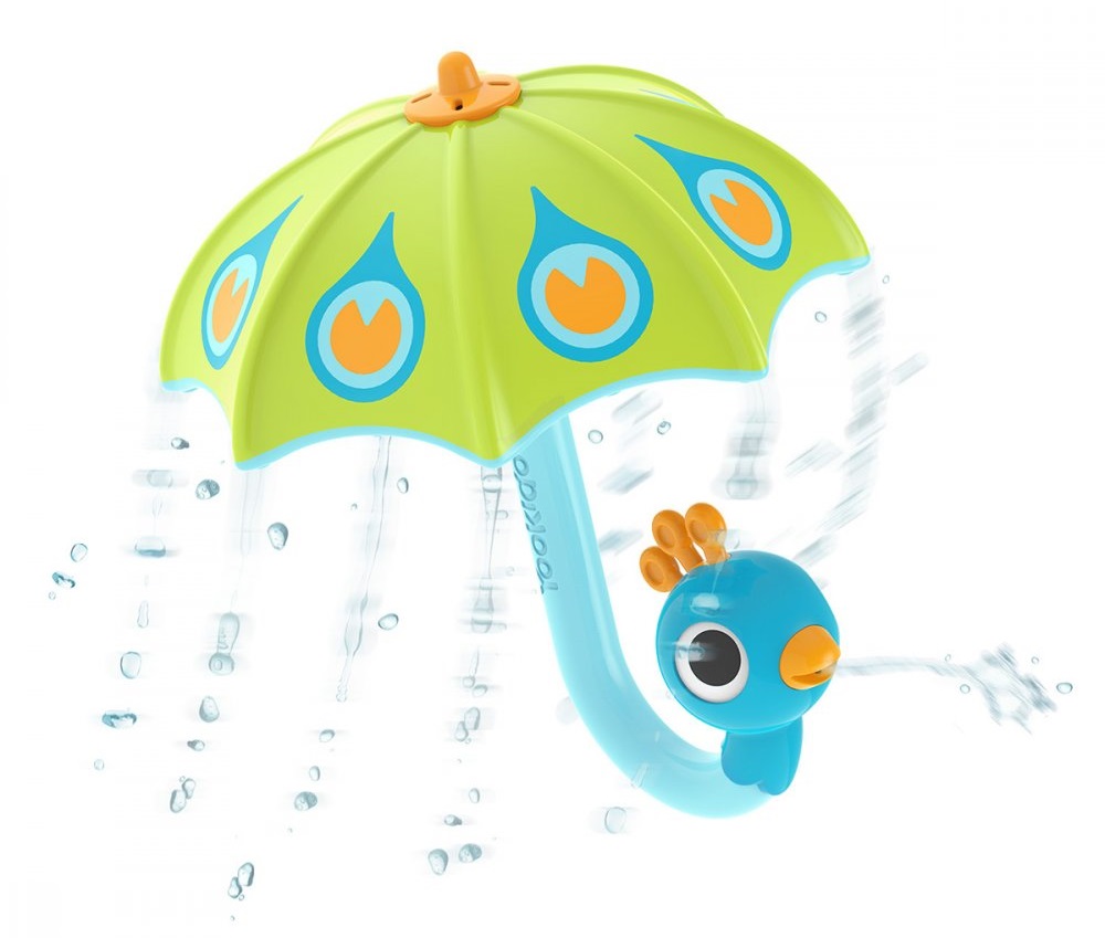 Parasol pawia pro stworzenia delikatnego deszczu w wannie. Po zanurzeniu w wodzie parasol napełnia się wodą, tworząc bąbelki. Po podniesieniu parasol tworzy delikatny deszcz, a z dzioba pawia tryska woda. Pro więcej zabawy zakręć parasolem i obserwuj, jak woda rozpryskuje się dookoła.