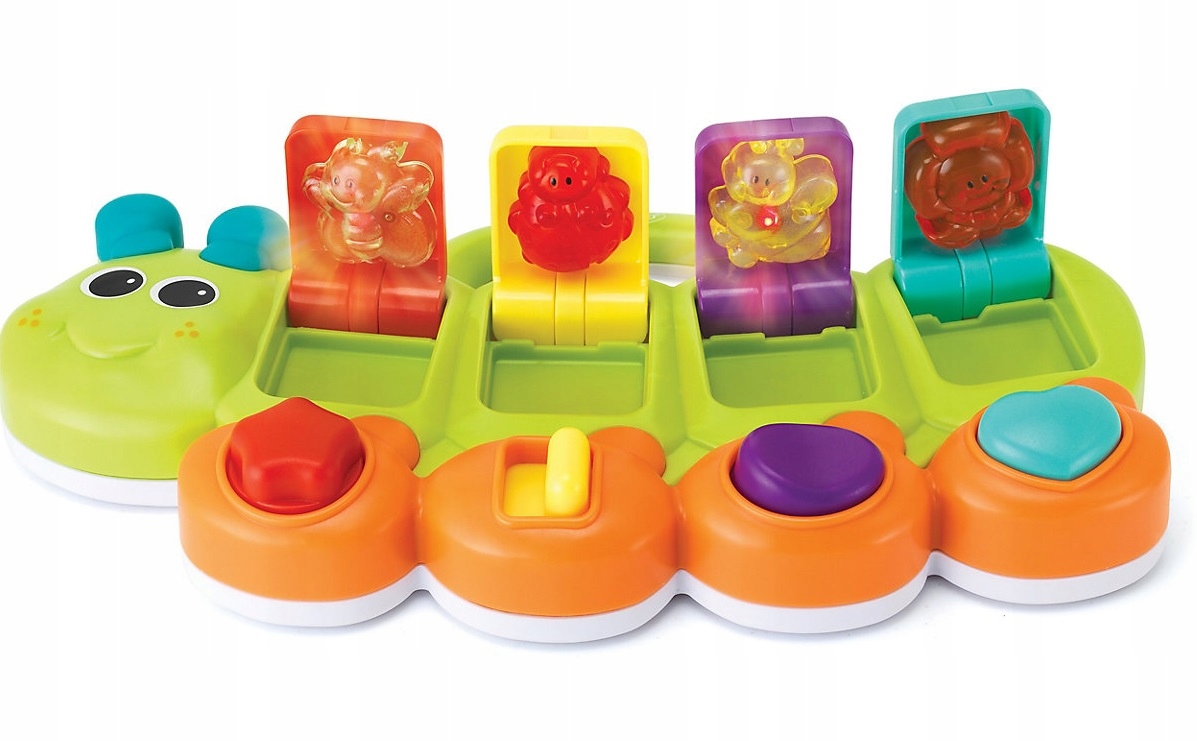 Zabawka w kształcie gąsienicy posiada efekty dźwiękowe i świetlne.