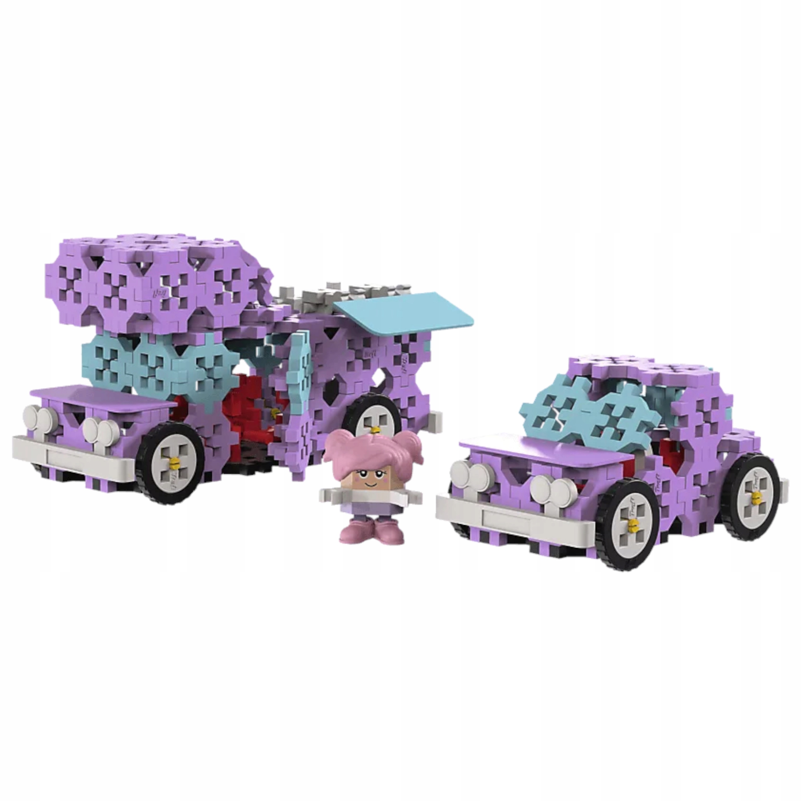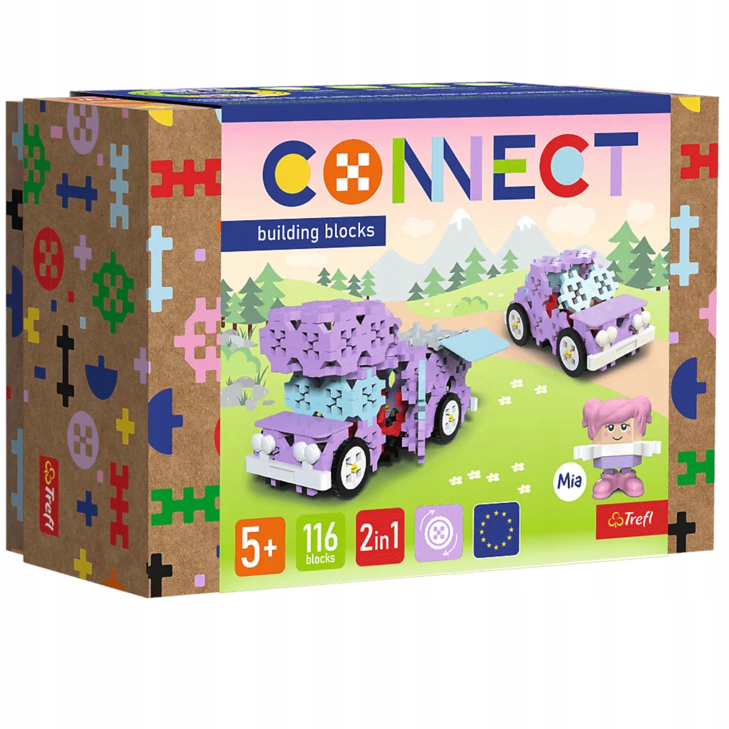 Zestaw klocków Connect 2w1 zawiera aż 116 klocków, z których można ułożyć dwa samochodziki: kampera lub autko albo można tworzyć własne konstrukcje. W zestawie są tez klocki dekoracyjne: okna, drzwi, maskę czy zderzaki, które uatrakcyjnią zbudowane samochodziki. Figurka kierowcy o imieniu Mia, pozwala na tworzenie własnych historii, pobudzając wyobraźnię dziecka.