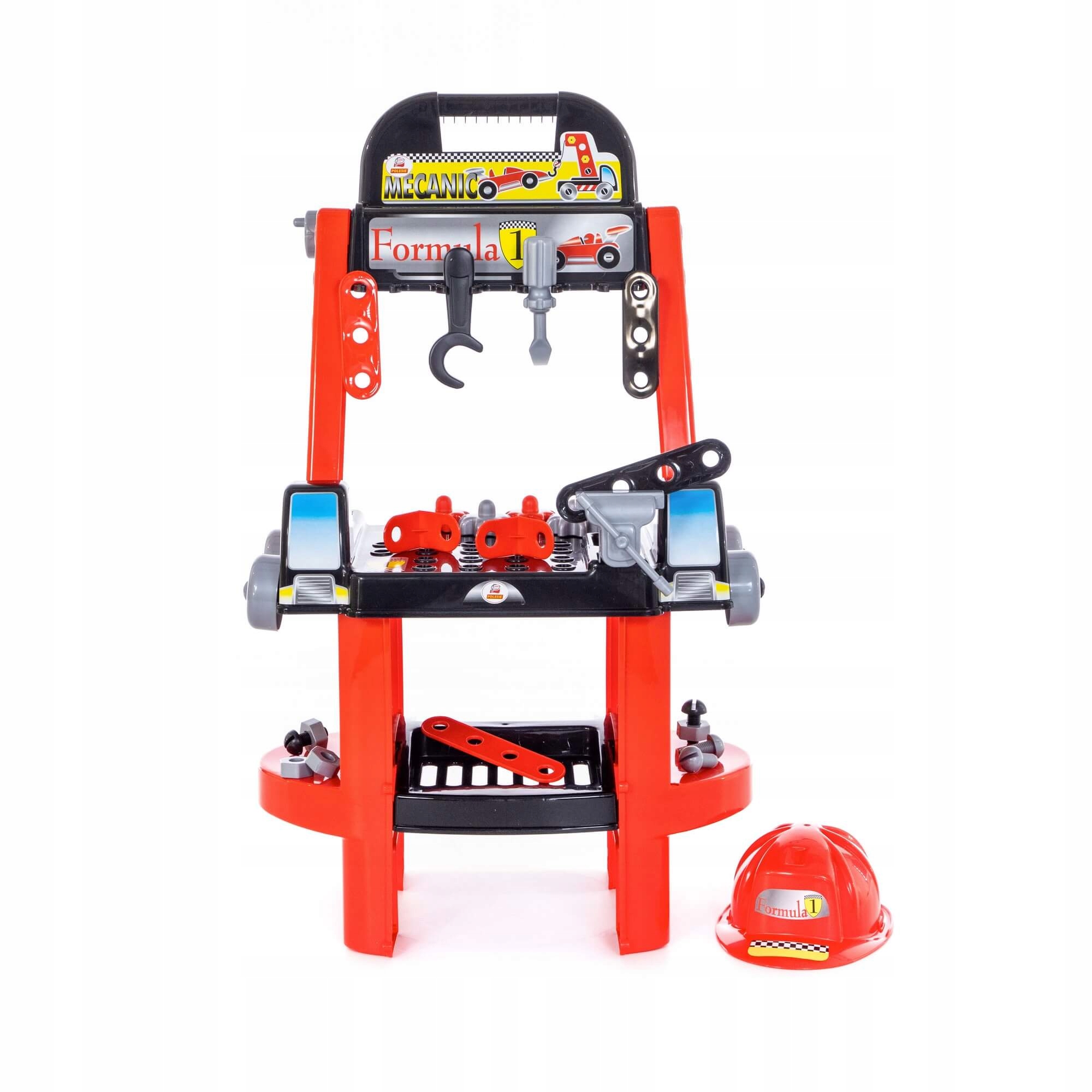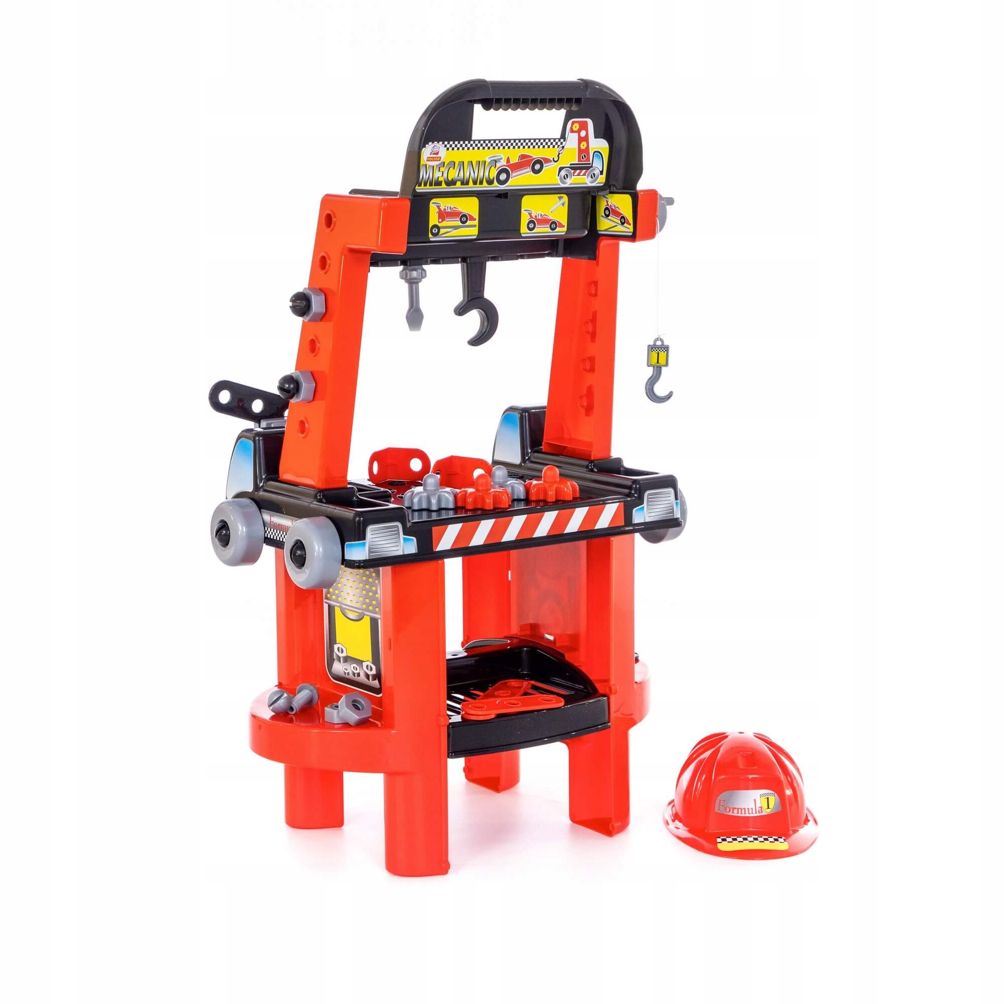 Zestaw Majsterkowicza “Mechanik – Super” od renomowanej firmy Polesie jest idealny dla dziecka chcącego wcielić się w rolę super mechanika. Jeśli Twoje dziecko fascynuje się mechaniką będzie to idealny zestaw dla niego. Największą zaletą zestawu jest duża ilość elementów, dzięki czemu dziecko będzie mogło majsterkować i naprawiać wiele zabawek. Zestawie mechanika pod specjalnym blatem znajduję się półka do przechowywania zbędnych w danym momencie narzędzi. Na poprzeczce łączącej boki warsztatu (w najwyższym punkcie) umieszczono haczyk np. na klucz francuski. Oprócz tego dołączono do niego komplet akcesoriów: śrubokręt, klucz francuski, płaskie elementy do skręcania, śrubki i nakrętki, pokrętła, imadło oraz kask. Ogromna liczba naklejek zawartych w zestawie pozwoli na atrakcyjne ozdobienie całego warsztatu.