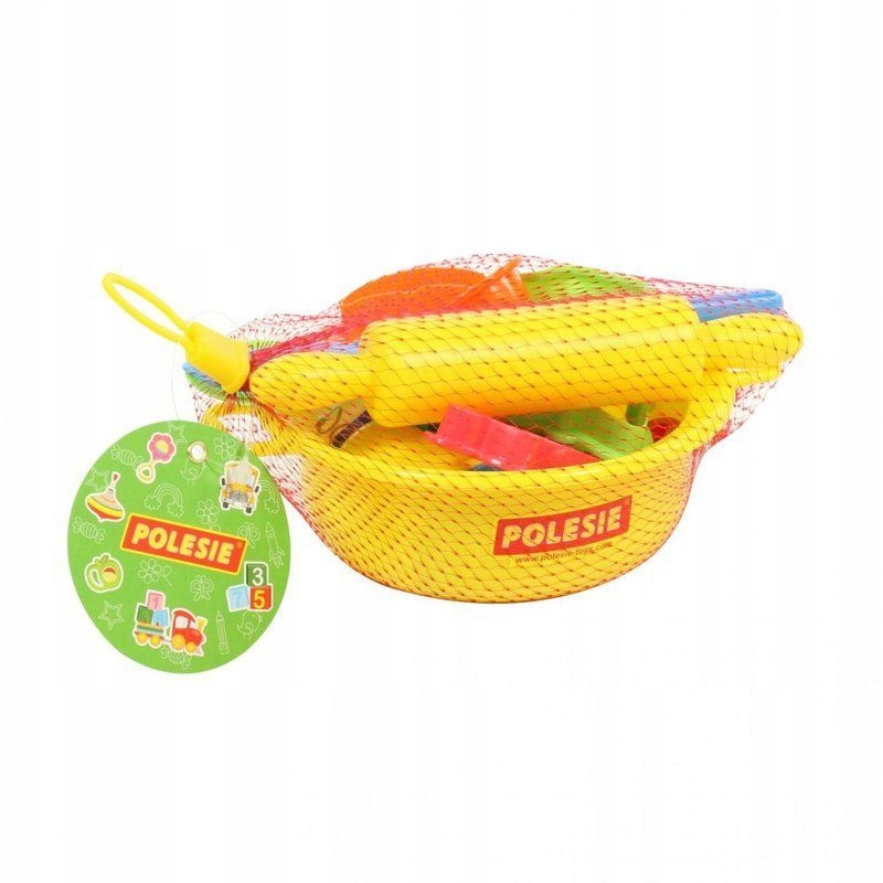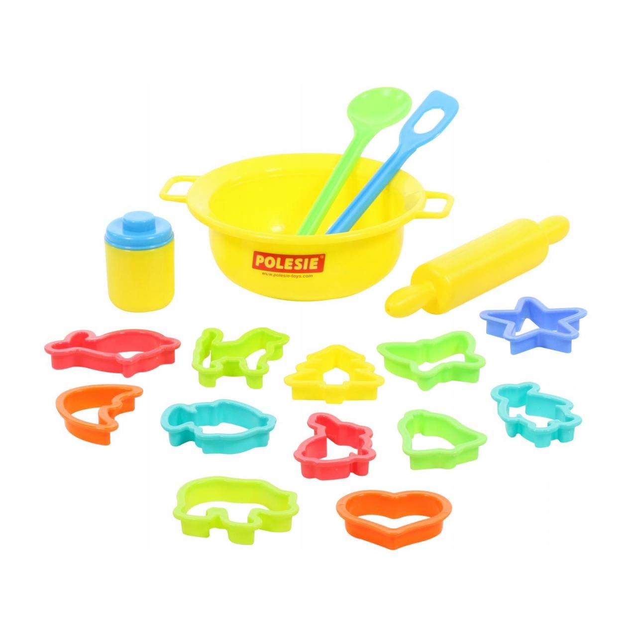 W zestawie znajduje się 18 elementów: wałek, lyżka, miska, foremki.